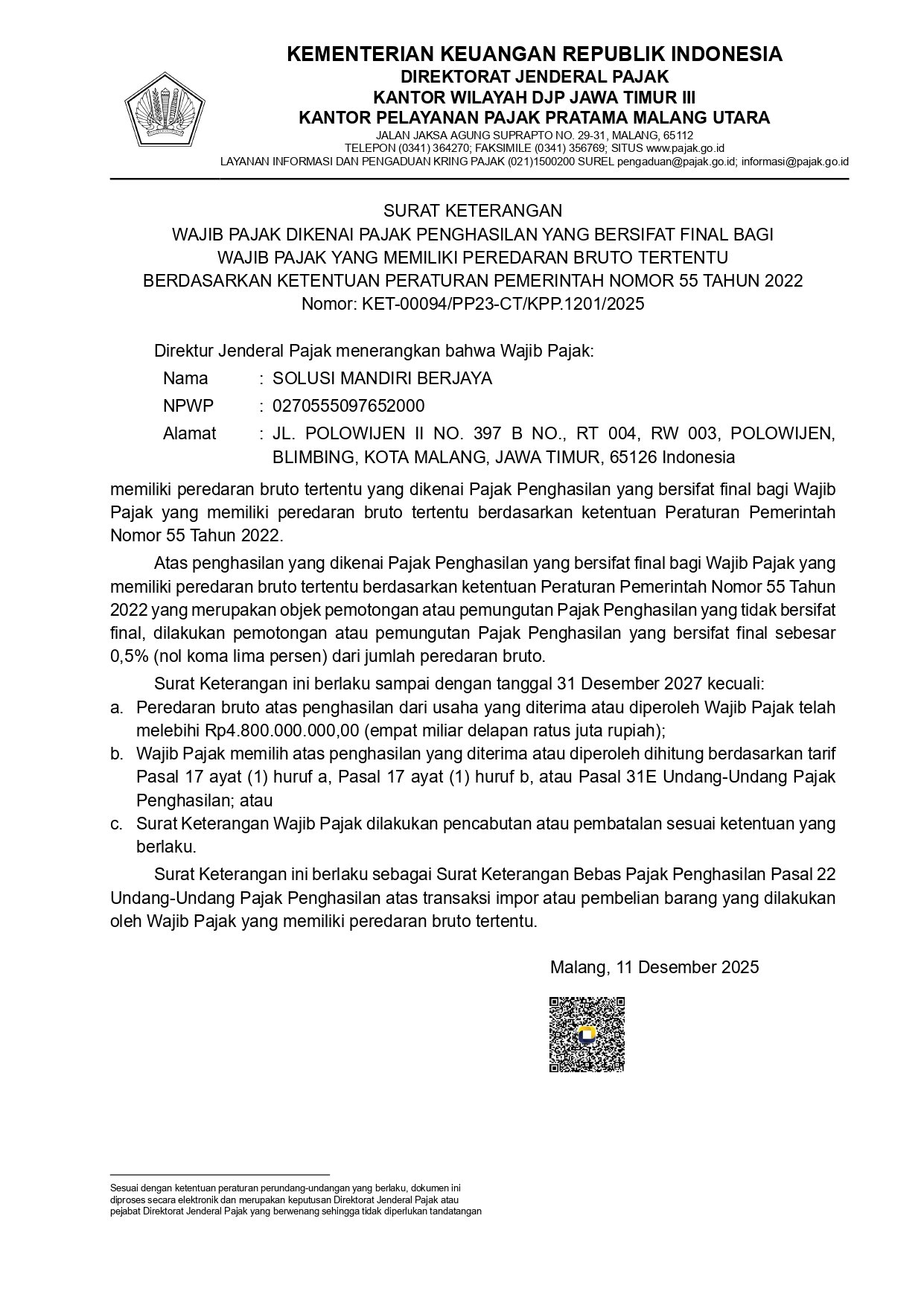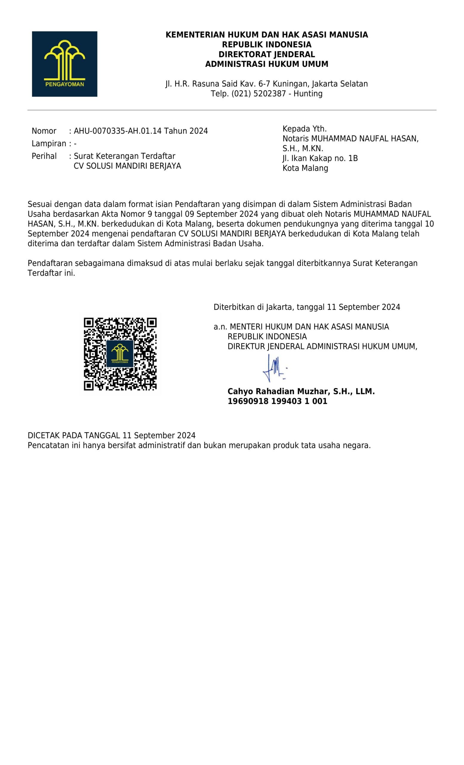 Perusahaan kami berdiri tahun 2024 dan telah memiliki legalitas resmi sesuai peraturan pemerintah. Dalam menjalankan usaha kami berusaha untuk memberikan layanan terbaik kepada pelanggan kami dengan komitmen dan dukungan penuh. Kepuasan pelanggan adalah fokus utama kami.